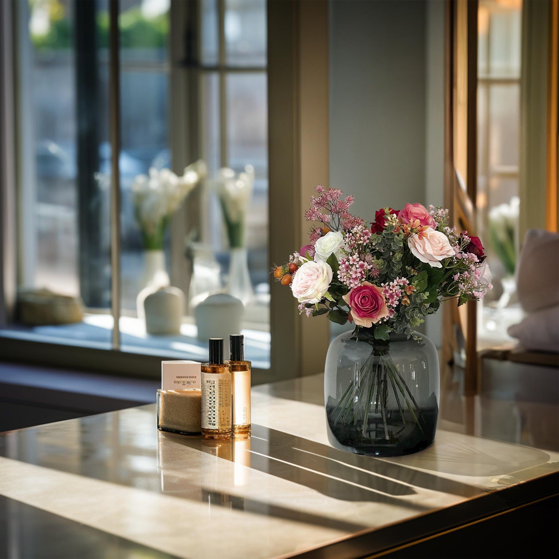 Breng warmte en elegantie in huis met het Flame Roses kunstboeket van Blad & Bloei. Dit luxe boeket van 45 cm combineert levendig gekleurde rozen met frisgroen blad en subtiele besjes, met de hand samengesteld door ervaren bloemisten voor een verfijnde, natuurlijke look.
