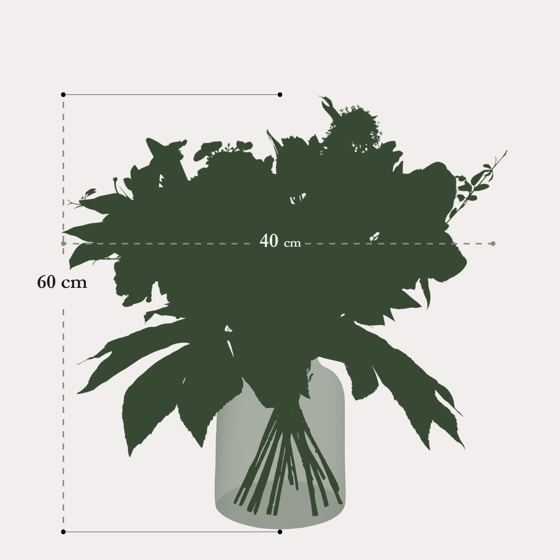Het boeket bestaat uit verschillende bloemsoorten en bladerstructuren, wat zorgt voor een rijke en elegante look. Perfect in een hoge vaas op tafel, een dressoir of als cadeau voor iemand die van een moderne, rustige sfeer houdt.